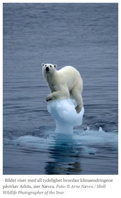 Et svært mye brukt bilde i forbindelse med klimaspørsmål er Arne Nævras bilde av en isbjørn som har klatret opp på en isklump som flyter i vannet. Et omvendt bildesøk på TinEye på internett resulterte per dato til noe over 4 800 treff på bildet. I følge Aftenposten skal Arne Nævra ha uttalt følgende da bildet kom på 2. plass i kategorien «Vår verden» i fotokonkurransen Shell Wildlife Photographer of the Year 2007: